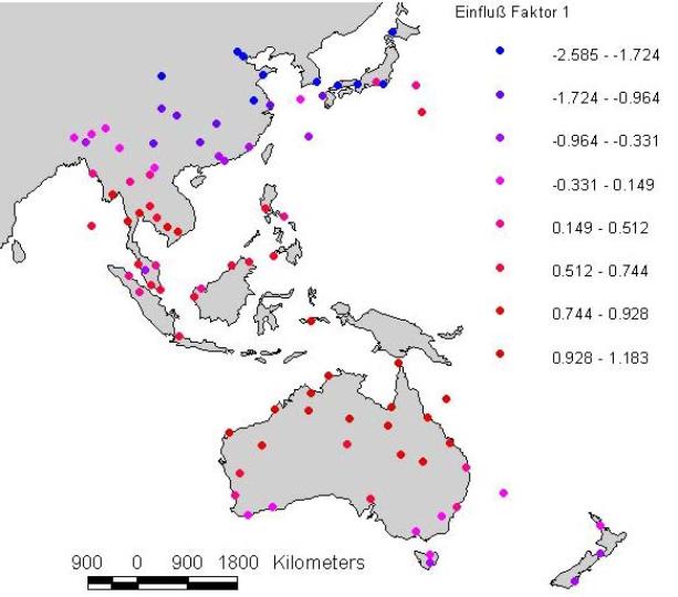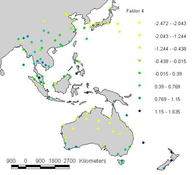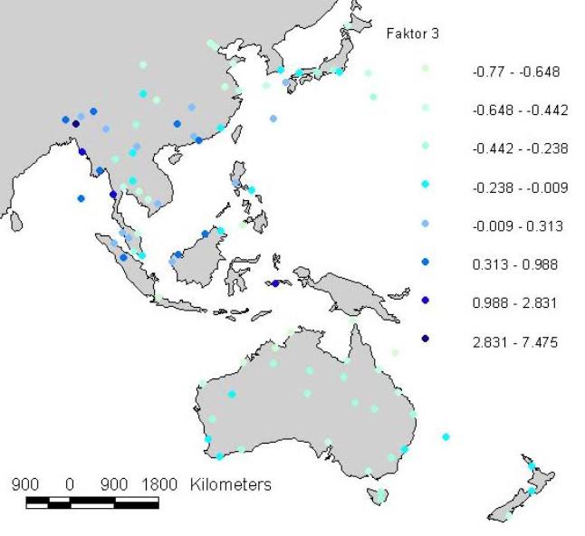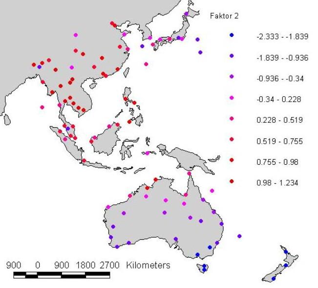 Der Faktor 2 ist das Gegenstück zu Faktor 1. Er enthält hohe Ladungen (über 500) nur bei Mai- und Augustwerten der Temperatur und der Potentiellen Verdunstung. Auf der Karte (Einfügung 10) zeigt sich eine Verteilung im Nordsommer und schwächer im tropischen Bereich. Deutlich sieht man den Südwinter in Tasmanien und auf Neuseeland.