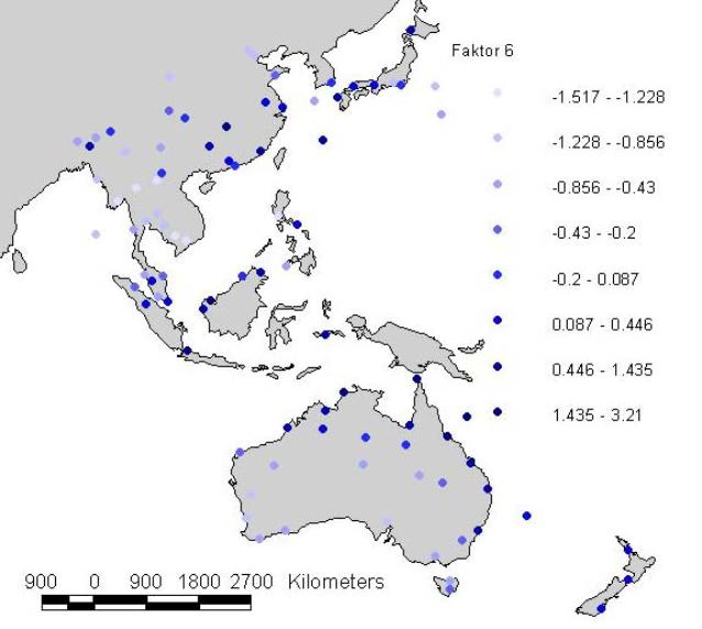 Der letzte Faktor zeigt den Niederschlag im Südsommer und im Nordwinter. Er weist nicht durchgehend so hohe Ladungen auf wie die Faktoren 1- 3 und 5, ist aber in sich am eindeutigsten, da wirklich alle Feuchtewerte des Februars einfließen.