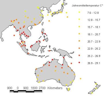 Hier sind mit Ozeanien die Räume Indonesien, Melanesien, Mikronesien, und Polynesien gemeint. Das Klima ist vorwiegend tropisch feuchtheiß. Leider finden sich in Mikronesien und Polynesien nur vereinzelt Meßstationen mit brauchbaren Werten. Das Verhältnis von ca. 1,25 Mio. km² Landmasse zu ca. 70 Mio km² Meer spricht für sich3. Im Gegensatz zum stark kontinental geprägten Klima Australiens weist Ozeanien dadurch sehr maritime Klimate mit ausgeglichenen Temperaturen von mindestens 20°C auf.